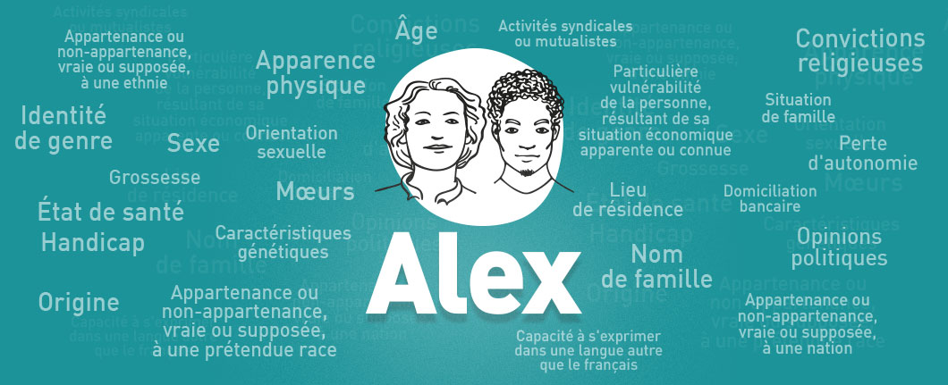 - Consiste à défavoriser une personne pour des motifs comme l’origine, le sexe, l’âge, l’orientation sexuelle, les convictions politiques, philosophiques ou religieuses etc..